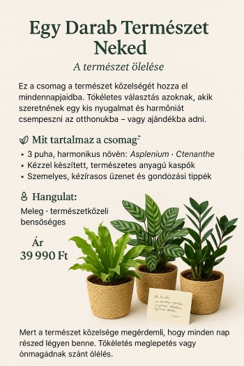 Ez a csomag a természet közelségét hozza el mindennapjaidba. Tökéletes választás azoknak, akik szeretnének egy kis nyugalmat és harmóniát csempészni az otthonukba vagy ajándékba adni.