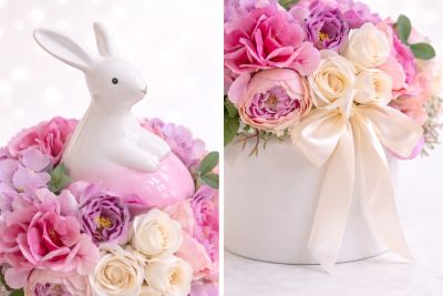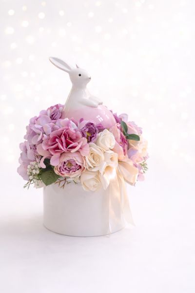 Kézzel készült, romantikus nyuszis virág box – cuki, elegáns és limitált ajándék