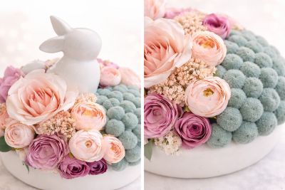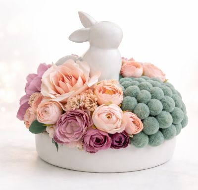 Finom pasztell virágok, különleges textúrák és egy letisztult nyuszis forma – modern elegancia egy kis játékossággal. 🐰🌸